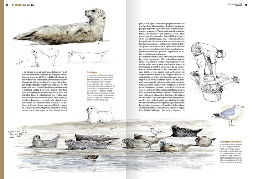 Coup de cœur (récurrent !) : la rubrique « Tout près d’ici » ! Par des descriptions sous forme de textes et d’encarts informatifs, des illustrations et de croquis naturalistes, ce format « notes de terrain » retranscrit une ambiance. Cet épisode est, à l’image de tous les numéros précédents, passionnant. Une façon originale de vulgariser un sujet, d’apprendre à reconnaître des espèces (ici, à différencier phoque gris et phoque veau-marin) sans passer par des termes trop techniques.