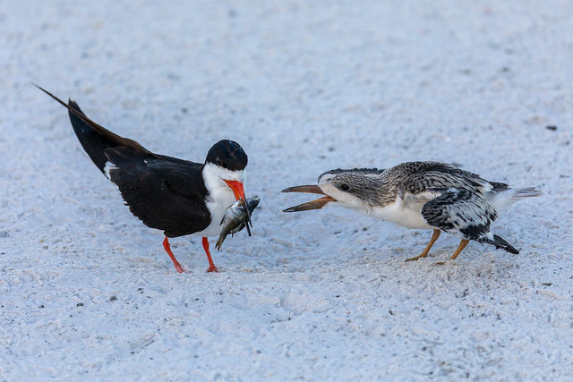 Encore un petit piège ! Il existe un seul oiseau dont la mandibule inférieure est nettement plus longue que la mandibule supérieure : le Bec-en-ciseaux ! Pourquoi une telle anatomie ? Parce que son mode de pêche l’exige. L’oiseau vole à la surface de l’eau et y plonge la mandibule inférieure. Ainsi, il va pouvoir capturer de petits poissons et des crustacés. Les proies mesurent jusqu’à 12cm !